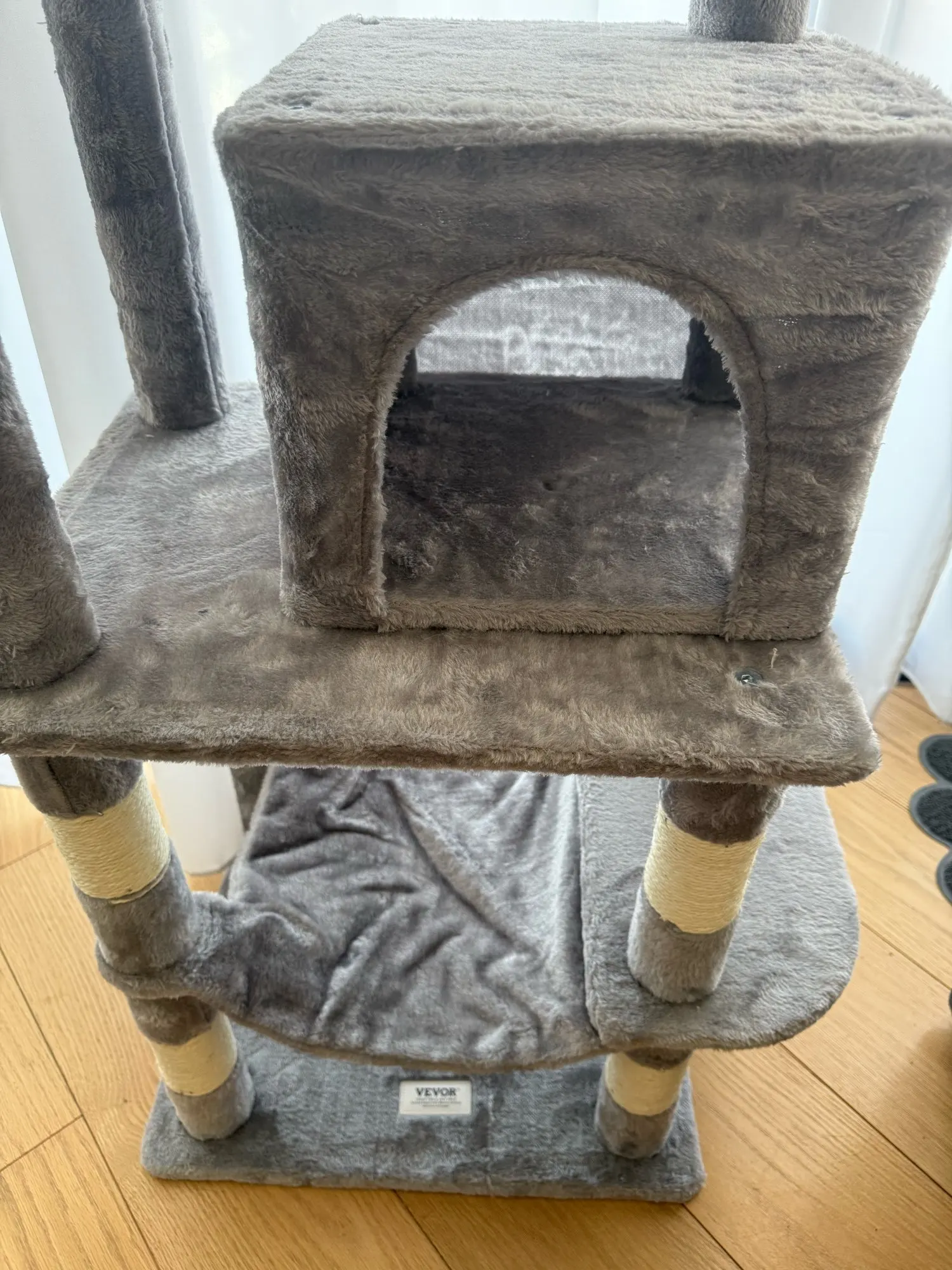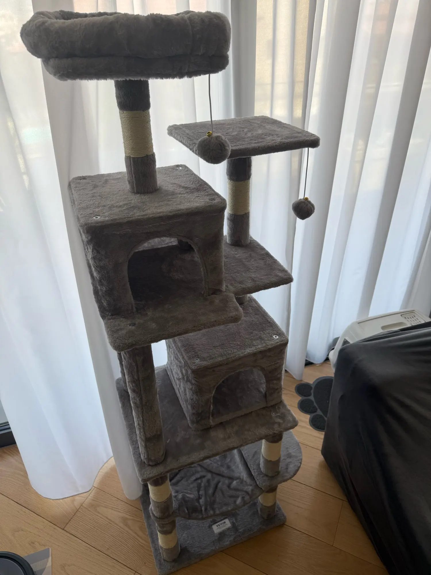Multiple Resting Spots: Cozy condo, hammock, wicker perch, and flower bed – giving cats options for napping or observing.